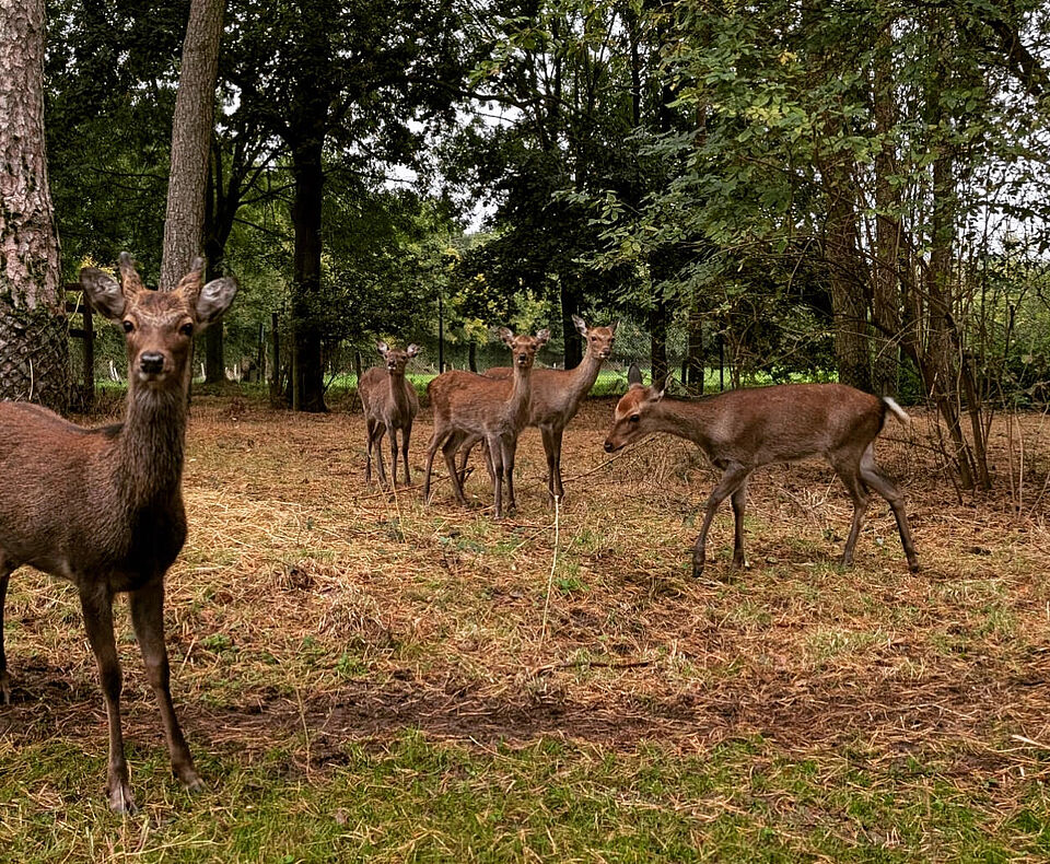 Fünf neugierige Sikahirsche freuen sich auf Besuch im Tannenbusch