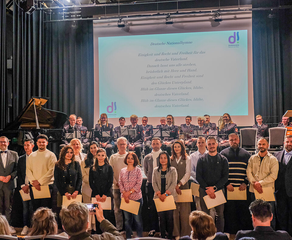Die Neubürgerinnen und Neubürger legten ihr feierliches Bekenntnis ab. Im Anschluss erhielten sie ihre Einbürgerungsurkunden, bevor gemeinsam die deutsche Nationalhymne gesungen wurde.