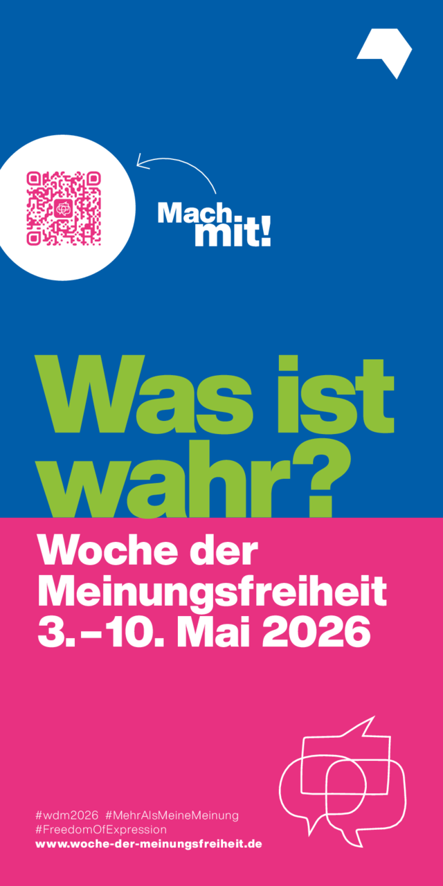 Vom 3. bis 10. Mai 2026 findet die Woche der Meinungsfreiheit zum sechsten Mal statt. Unter dem Motto „Was ist wahr?“ bewegt sich die bundesweite Aktionswoche im Spannungsfeld zwischen Fakten, Meinungen und Wahrhaftigkeit.