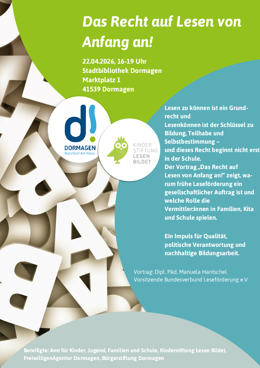 Das Lesenetz Dormagen lädt am Mittwoch, dem 22.04.2026, 16:00 – 19:00 Uhr zu einer Veranstaltung in die Stadtbibliothek ein. Unter dem Motto Das Recht auf Lesen von Anfang an! wird es einen ca. 30minütigen Impulsvortrag von Dipl. Päd. Manuela Hantschel, Vorsitzende des Bundesverbands Leseseförderung e.V., geben.