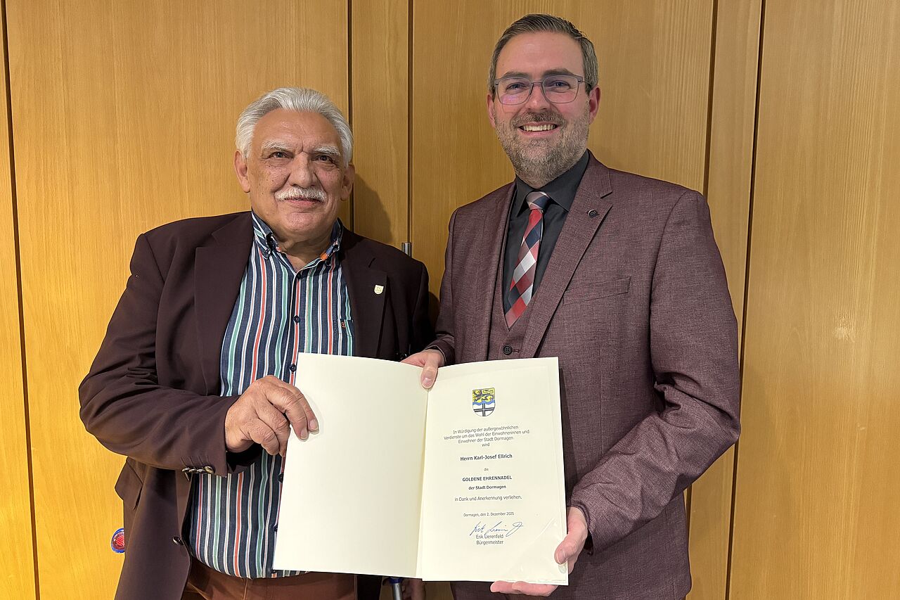 Die Stadt Dormagen hat Peter Hartmann (Senior) mit der Goldenen Ehrennadel ausgezeichnet. Die Ehrung fand am Samstag, 29. November, im Rahmen des Tannenbaum- und Krippenfestes der Kirmesgesellschaft „Selde Blömche“ in Ückerath statt.