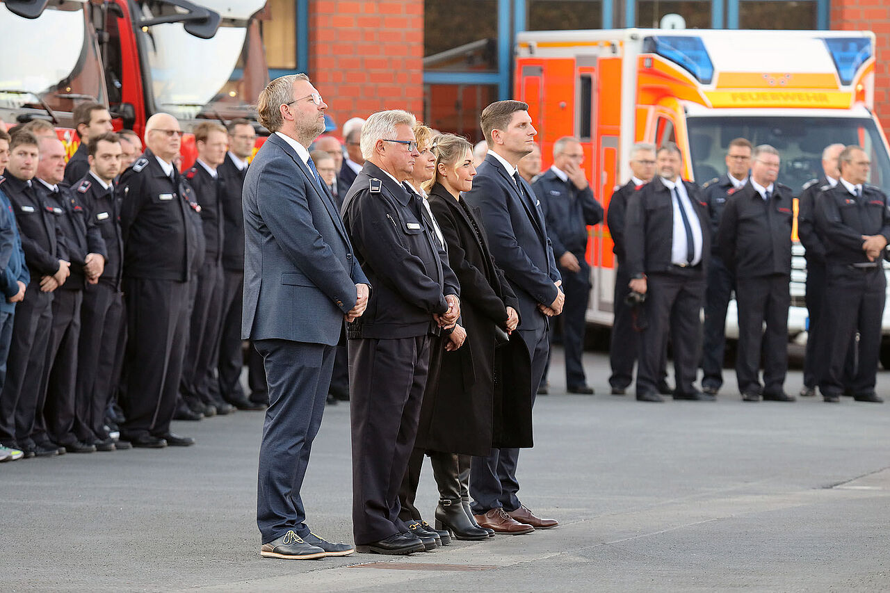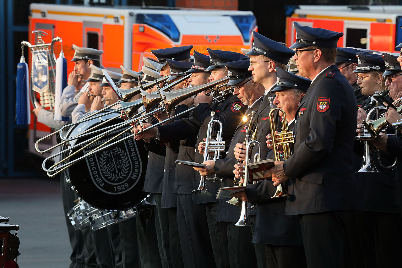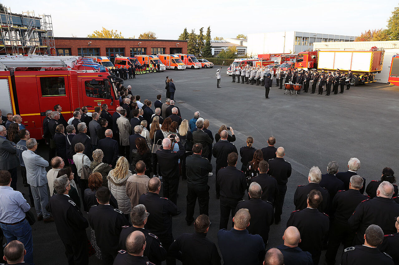 Nach mehr als 27 Jahren im Dienst der Feuerwehr Dormagen ist Wehrleiter Bernd Eckhardt als Fachbereichsleiter Feuerwehr/Rettungsdienst zum 30. September in den Ruhestand eingetreten. Bürgermeister Erik Lierenfeld würdigte sein jahrzehntelanges Engagement für Feuerwehr und Rettungsdienst und verlieh ihm im Rahmen der Verabschiedungsfeier am Dienstag, 30. September, die Goldene Münze der Stadt Dormagen. Zu Ehren von Bernd Eckhardt wurde die Feier von einem besonderen musikalischen Höhepunkt begleitet: Der Musikzug der Feuerwehr und das Tambourcorps Concordia Nievenheim spielten ihm einen großen Zapfenstreich.