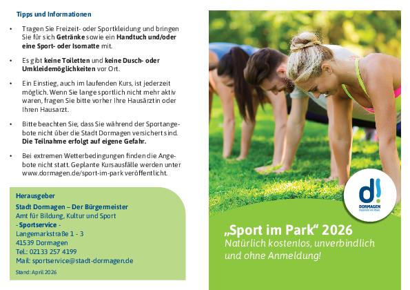 Die Angebote finden bei jedem Wetter statt – außer bei extremen Wetterlagen wie Gewitter oder ähnlichem. Informationen über geplante Absagen oder Änderungen von Veranstaltungen finden Interessierte unter www.dormagen.de/sport-im-park. An Feiertagen finden keine Kurse statt.