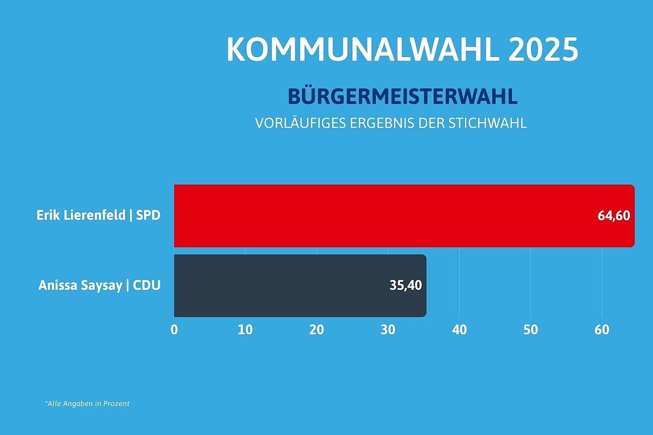 Die Stichwahl in Dormagen vom Sonntag, 28. September, ist entschieden: Erik Lierenfeld (SPD) setzte sich bei der Wahl zum Bürgermeister mit 64,6 Prozent der Stimmen gegen seine Mitbewerberin Anissa Saysay (CDU) durch, die auf 35,4 Prozent kam. Damit bleibt Lierenfeld Bürgermeister der Stadt Dormagen und geht in seine dritte Amtszeit.
