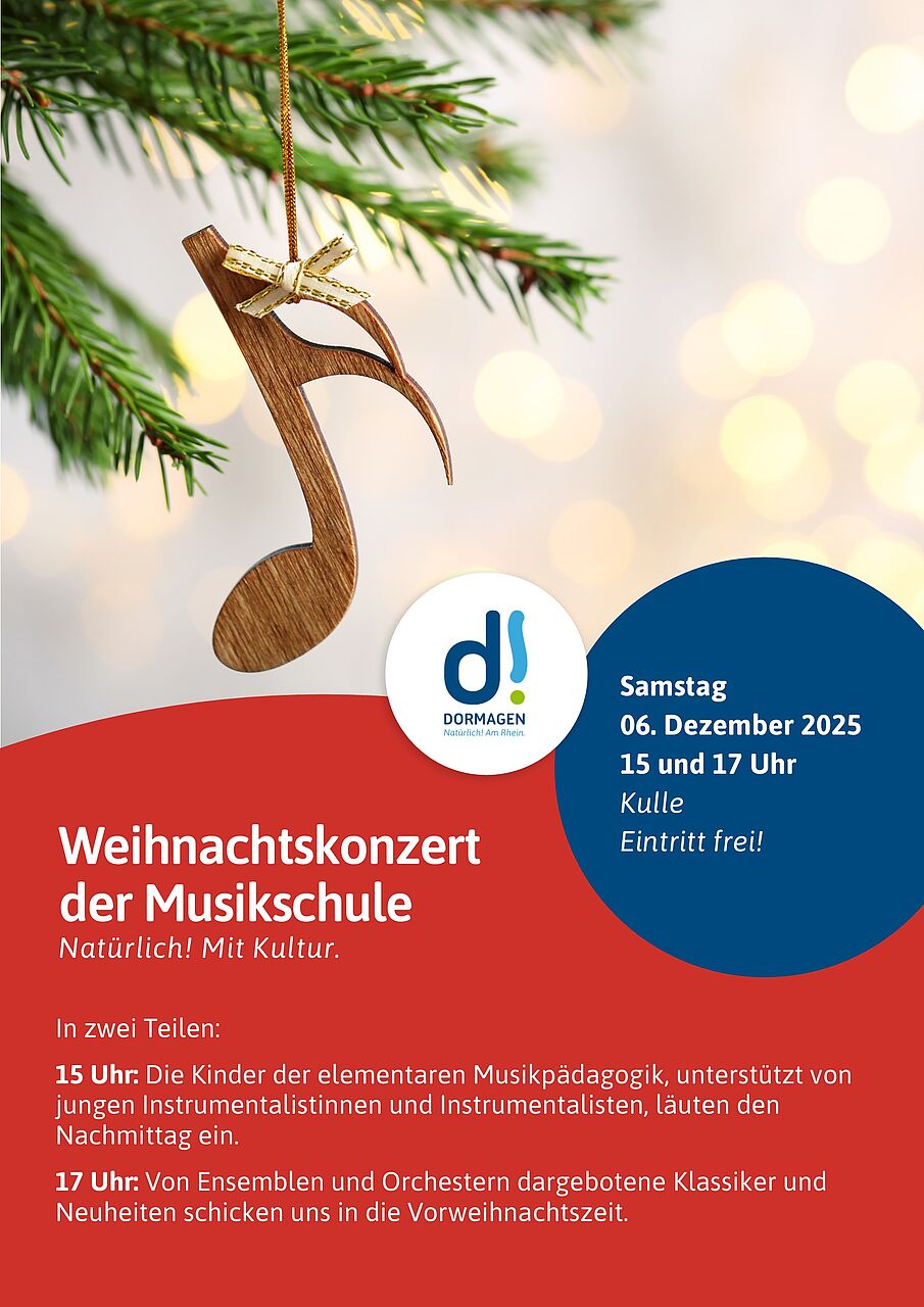 Die Musikschule Dormagen lädt für Samstag, 6. Dezember, zu ihren traditionellen Weihnachtskonzerten in die Kulle, Langemarkstraße 1-3, ein. Zum Jahresabschluss erklingen dort um 15 und 17 Uhr gleich zwei festliche Programme.