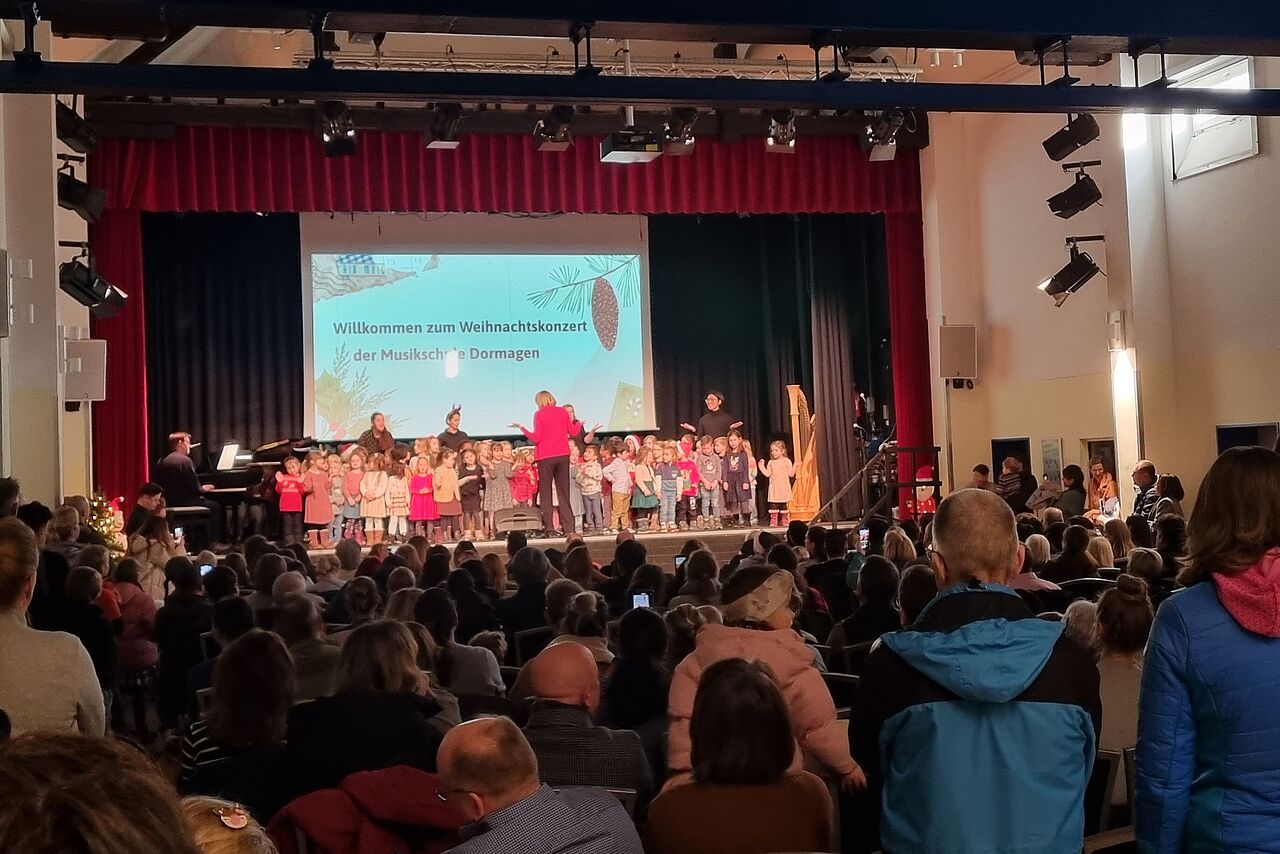 In weihnachtlicher Atmosphäre eröffnen zunächst die Kinder der elementaren Musikpädagogik gemeinsam mit jungen Instrumentalistinnen und Instrumentalisten den Nachmittag. Mit Liedern und Tänzen stimmen sie das Publikum auf die Adventszeit ein.